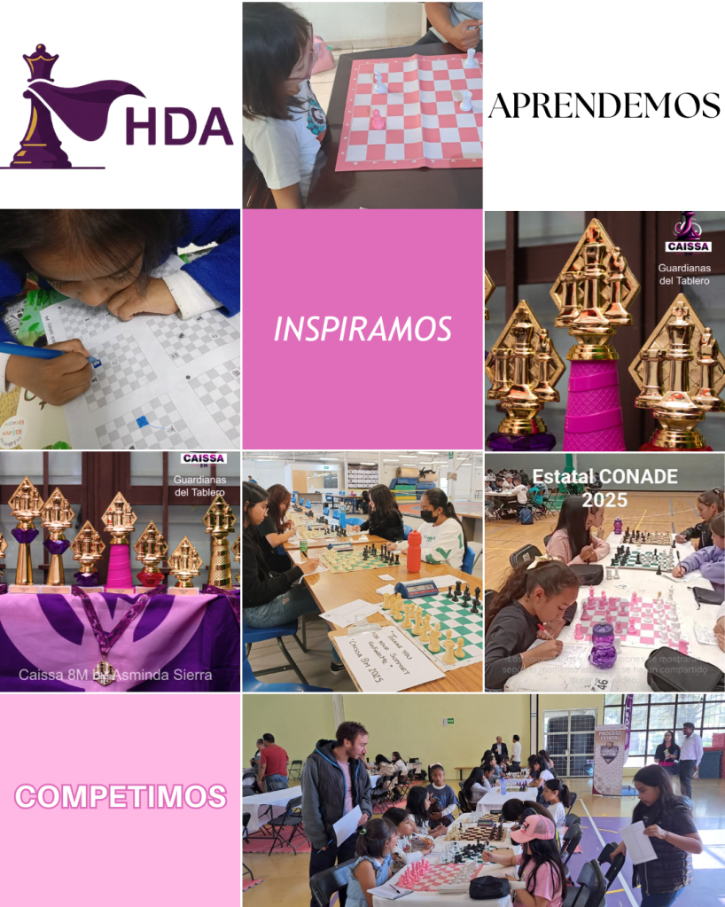 En HDA Heroínas del Ajedrez, creemos firmemente en el poder del juego ciencia para transformar vidas. Nuestro propósito es brindar a las niñas las herramientas y la confianza necesarias para que destaquen tanto en el tablero como en cada ámbito de su vida. Para ello, reinvertimos todo lo recaudado de nuestras clases en becas, material de estudio (libros, juegos de ajedrez), inscripciones a la FIDE y en la organización de nuestro torneo anual Caissa 8M, que se celebra en la ciudad de Morelia, Michoacán.